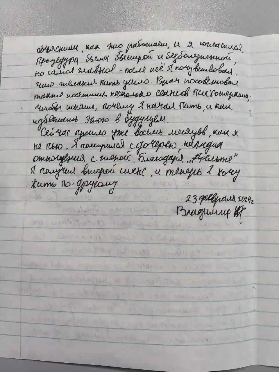 Мне провели детоксикацию: капельницы и медикаментозное лечение помогли мне почувствовать себя лучше уже через несколько дней. Затем врачи предложили пройти процедуру кодирования. Я долго сомневался, но специалисты подробно объяснили, как это работает, и я согласился. Процедура была быстрой и безболезненной, но самое главное — после неё я почувствовал, что желание пить ушло. Врач посоветовал также посетить несколько сеансов психотерапии, чтобы понять, почему я начал пить, и как избежать этого в будущем. Сейчас прошло уже восемь месяцев, как я не пью. Я помирился с дочерью, наладил отношения с женой. Благодаря "Дельте" я получил второй шанс, и теперь я хочу жить по-другому.